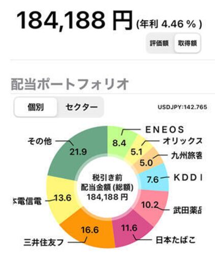 2023年の配当金 今年の配当金の合計がわかったので… 備忘録もかねて記録しておこうと思います。 楽天証券 95,310(税引き前)ー19,352=75,958 住信SBI証券 60,804(税引き前)ー12,345=48,459 LINE証券 26,660(税引き前)ー5,402=21,258 税引き後合計金額 …